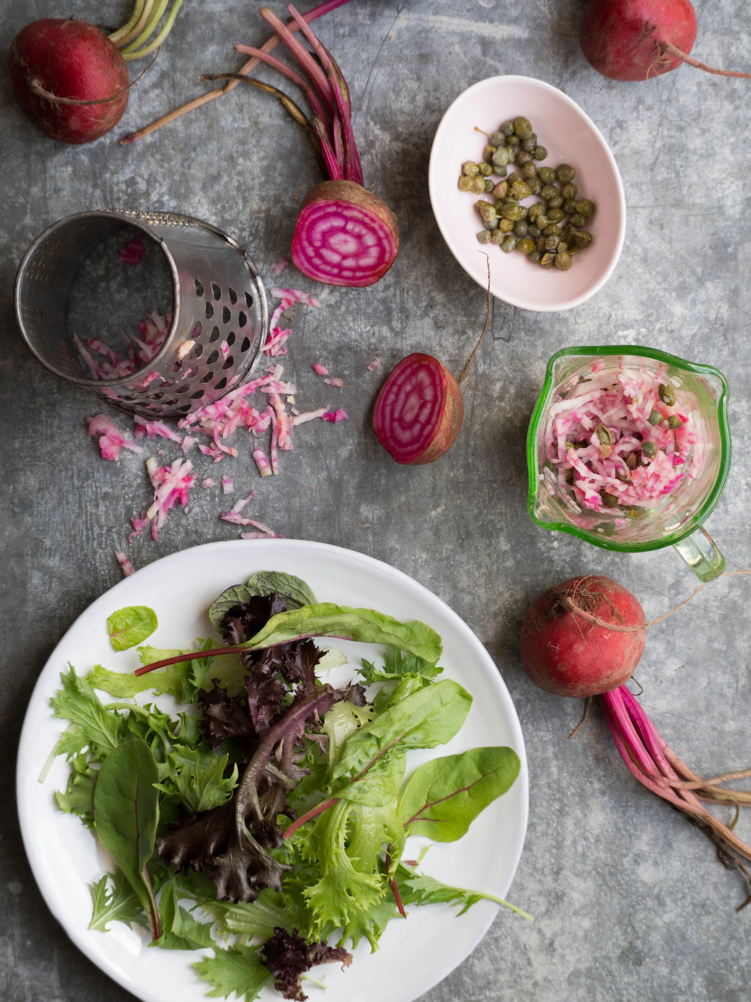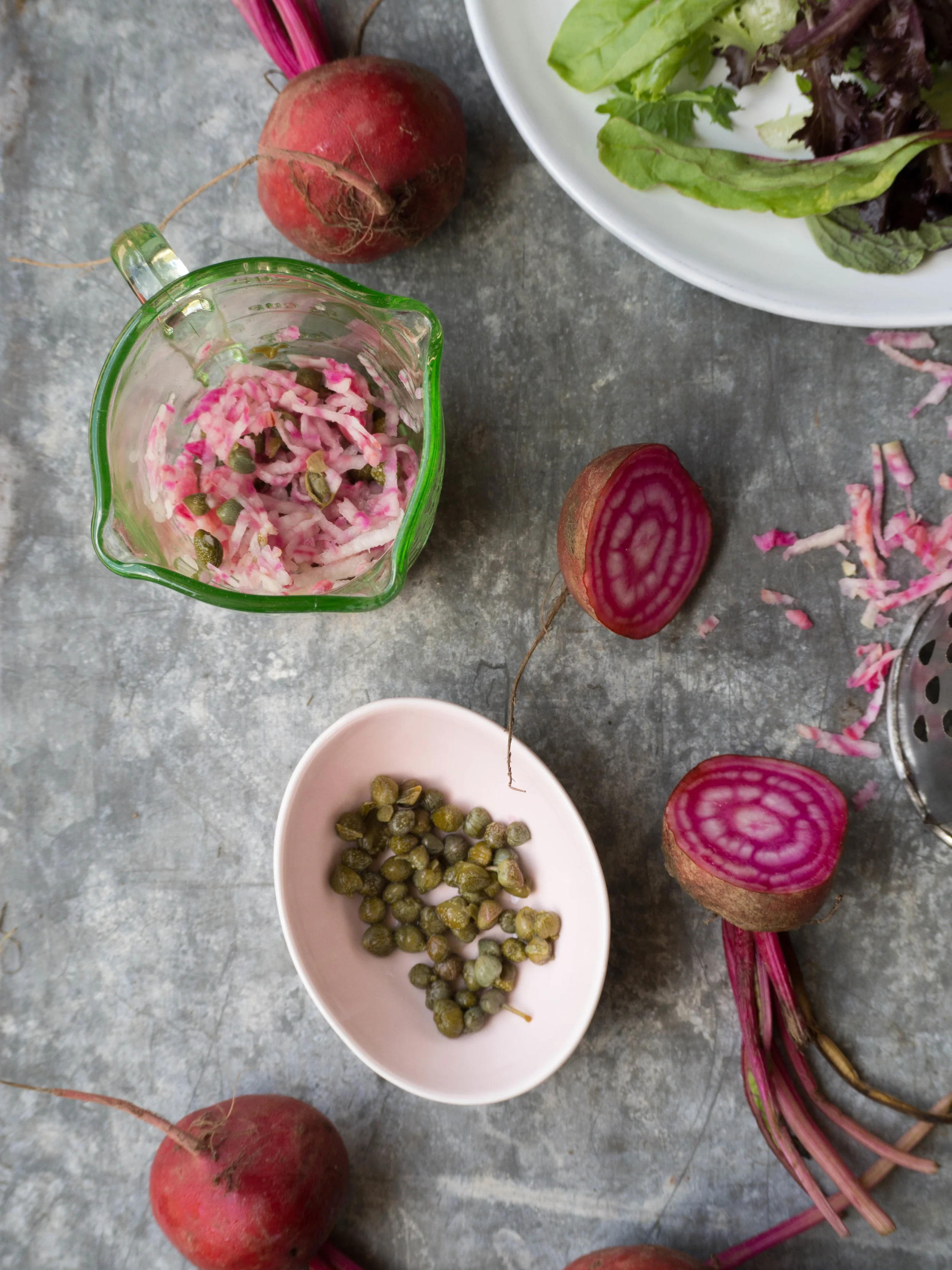 Lightly cover the grated beetroot with either some of the vinegar from the capers and/or some of the white vinegar. You don’t want the beetroot to be swimming in the vinegar, just enough so all the beetroot can lightly pickle. Leave to pickle while preparing the rest of the salad.