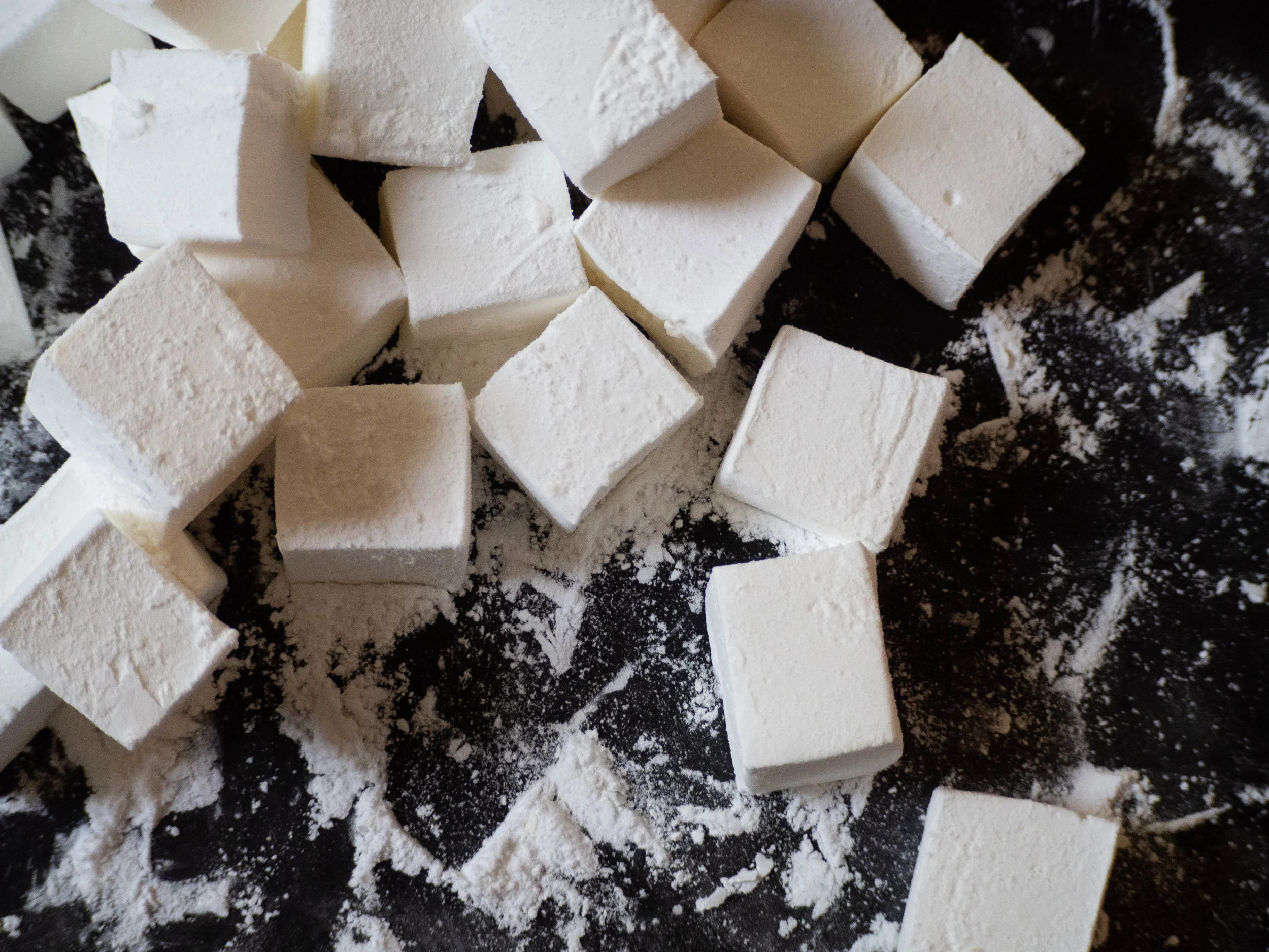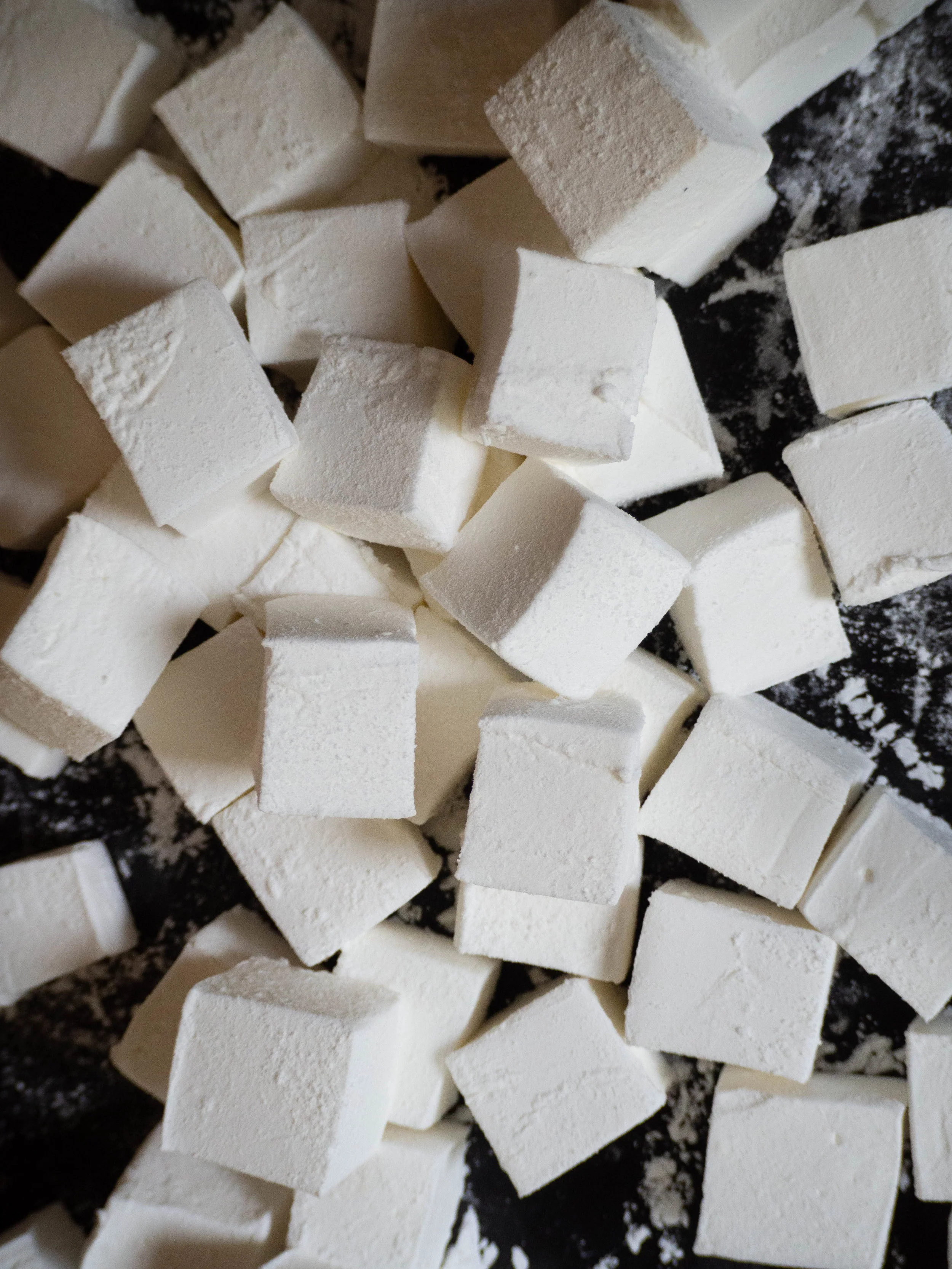 Dust more of the icing sugar mix over the top of the marshmallow slab, and around the sides. Using a large sharp knife, cut into cubes, by cutting the slab into rows, then cutting rows in the other direction. Dust your knife regularly with the icing sugar mix, and continue to dust the marshmallows as they are cut.