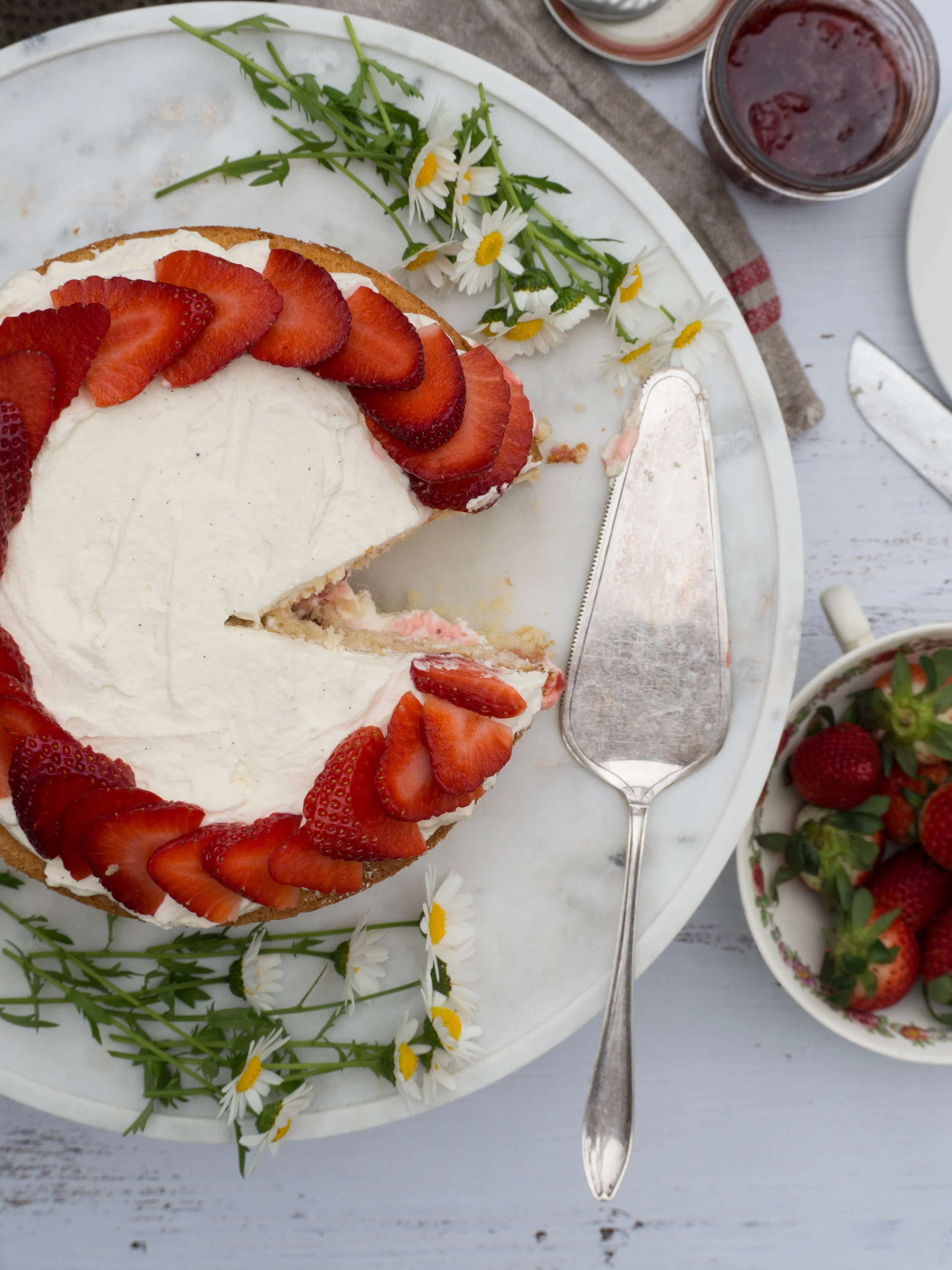 Transfer the cake batter into the tin and smooth the top. Push the rhubarb into the top of the cake a little, evenly covering the cake in the rhubarb pieces. Scatter the slivered pistachios over the top of the cake.