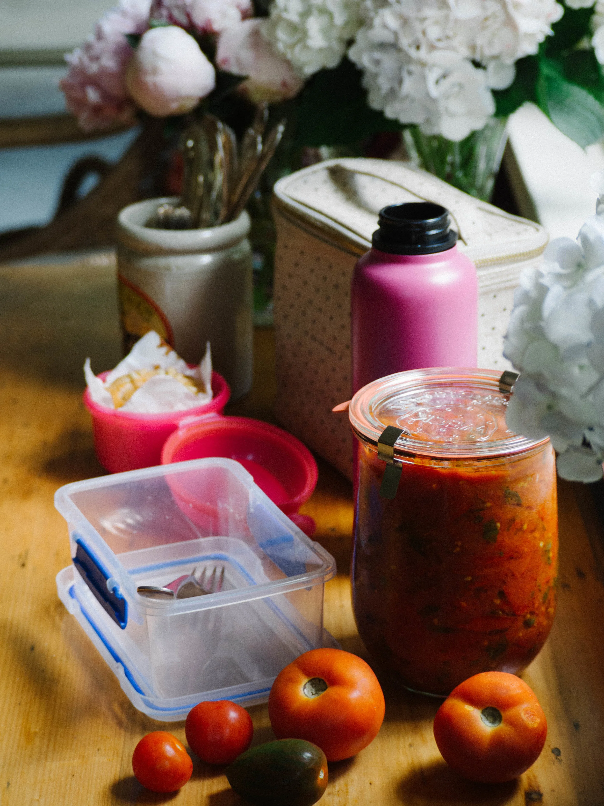 This chunky tomato sauce is staple for work week lunch prep for me. I have been making it consistently for the past year, and I am still not sick of it. I love tomatoes, and I have found so many uses for this sauce I never tire of it. For a work week lunch I will pair it with pasta or quinoa, add some extra basil, parmesan cheese and maybe some prosciutto and I have a meal I really look forward to eating. I can prepare a few portions of this in advance, and have it ready in the fridge to take to work in the mornings.