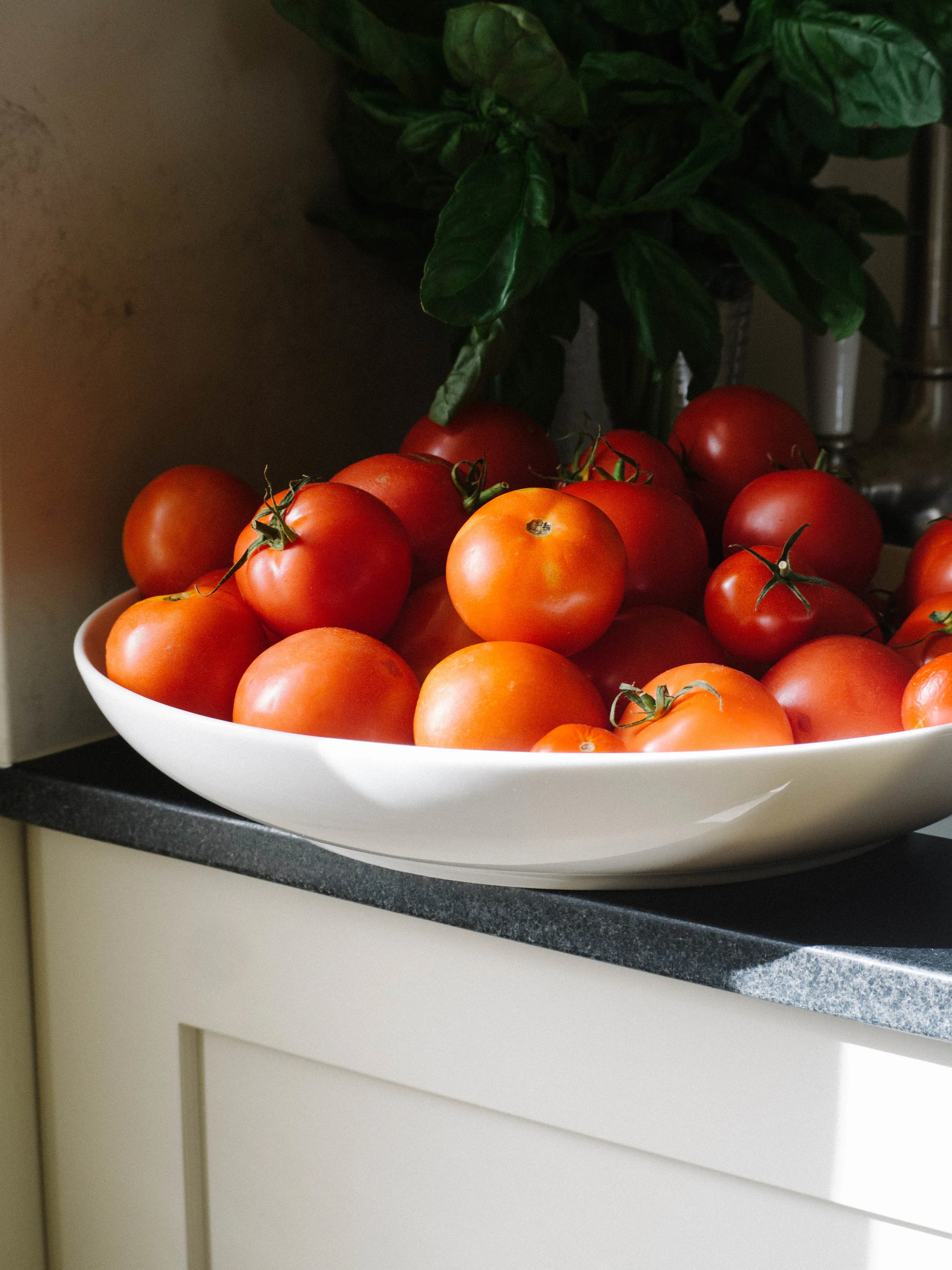 Remove from the oven and transfer all the tomatoes into one of the pans. Stir in the tomato paste and basil. Use immediately or allow to cool in the pans and transfer to large glass jars to store in the fridge until needed.